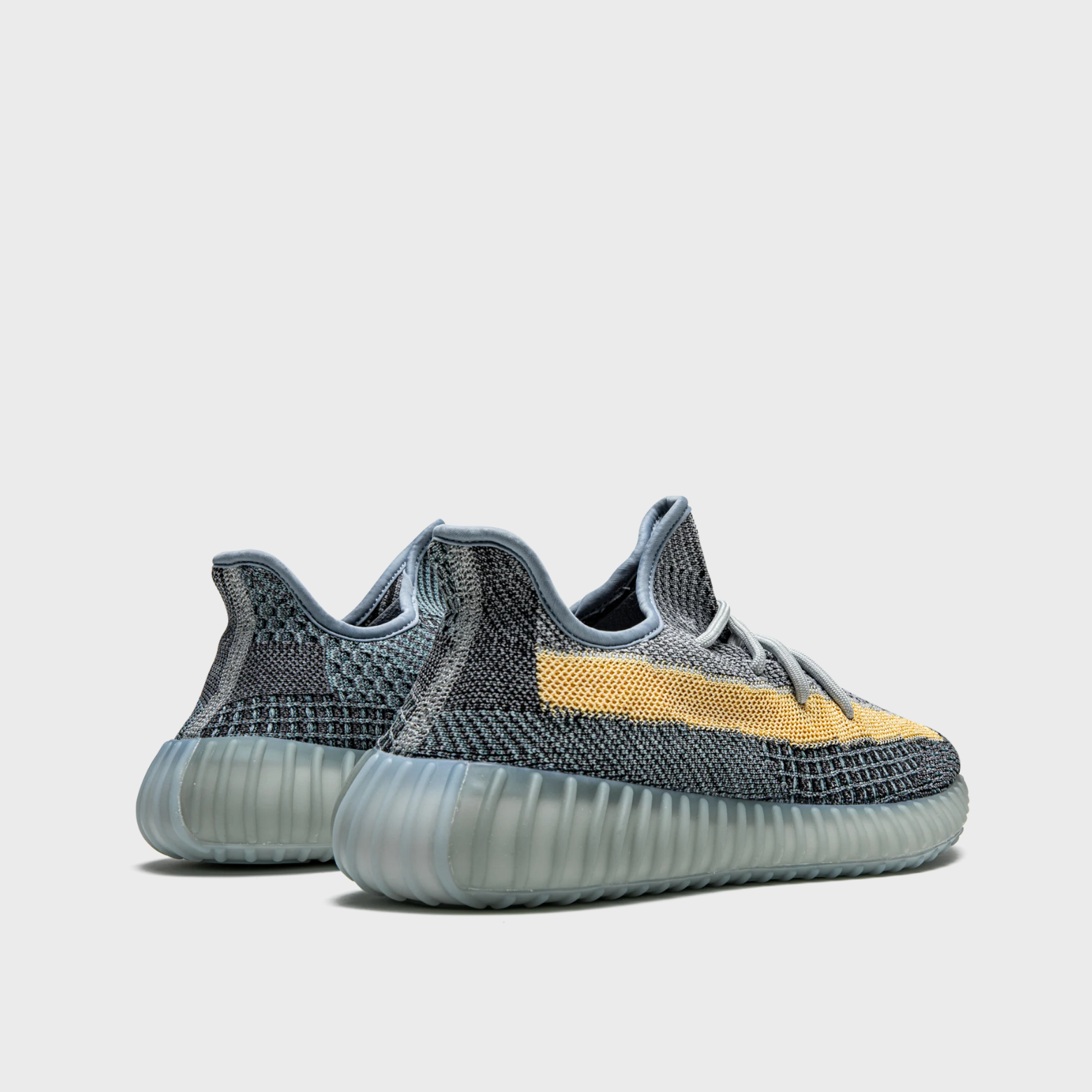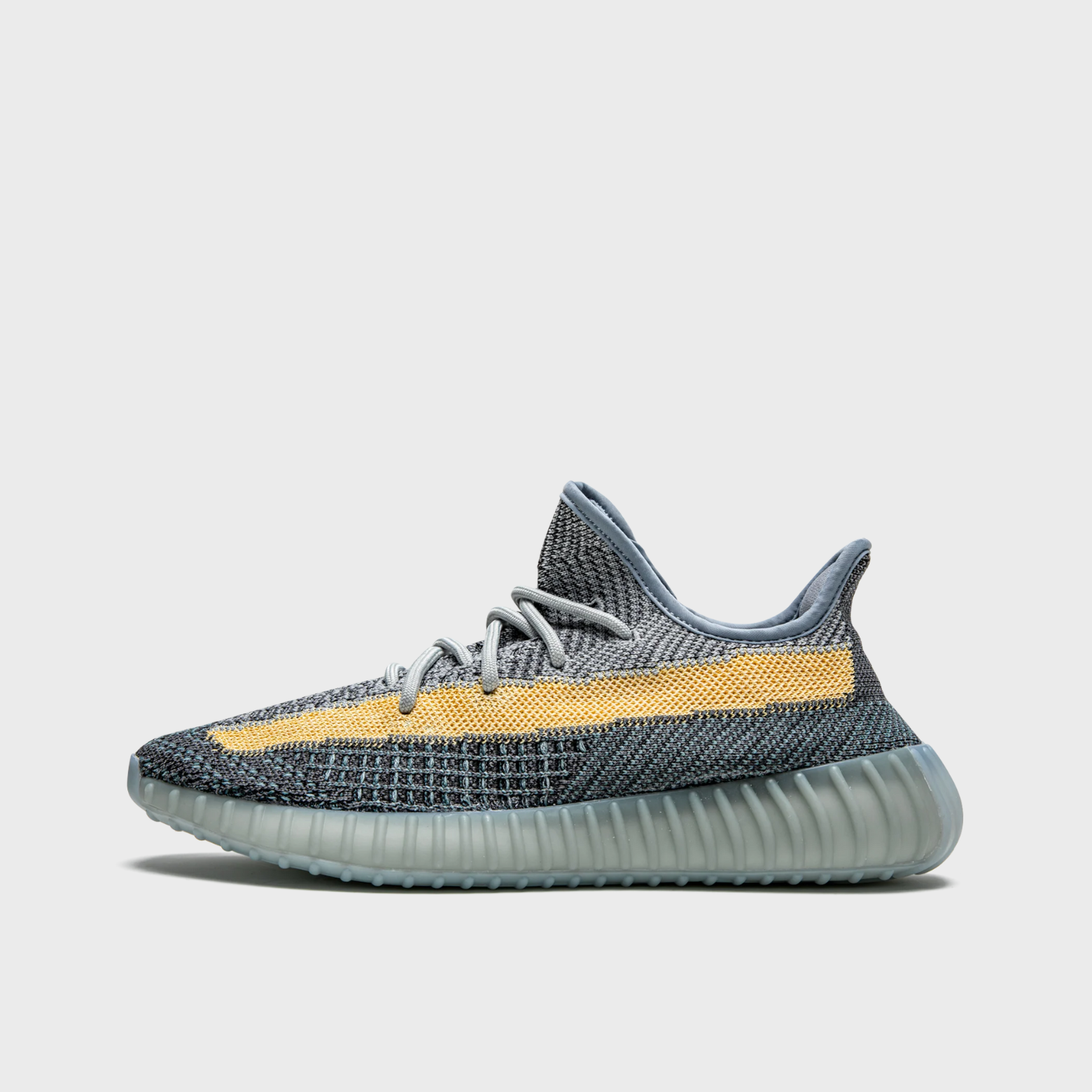 This distinctive colorway dresses the streamlined silhouette in a slate/ash blue Primeknit with heathered grey threading, punctuated by a bold tan/yellow monofilament side stripe for contrast. Rope laces and the ribbed, semi-translucent shell keep the look true to the 350 V2 lineage.