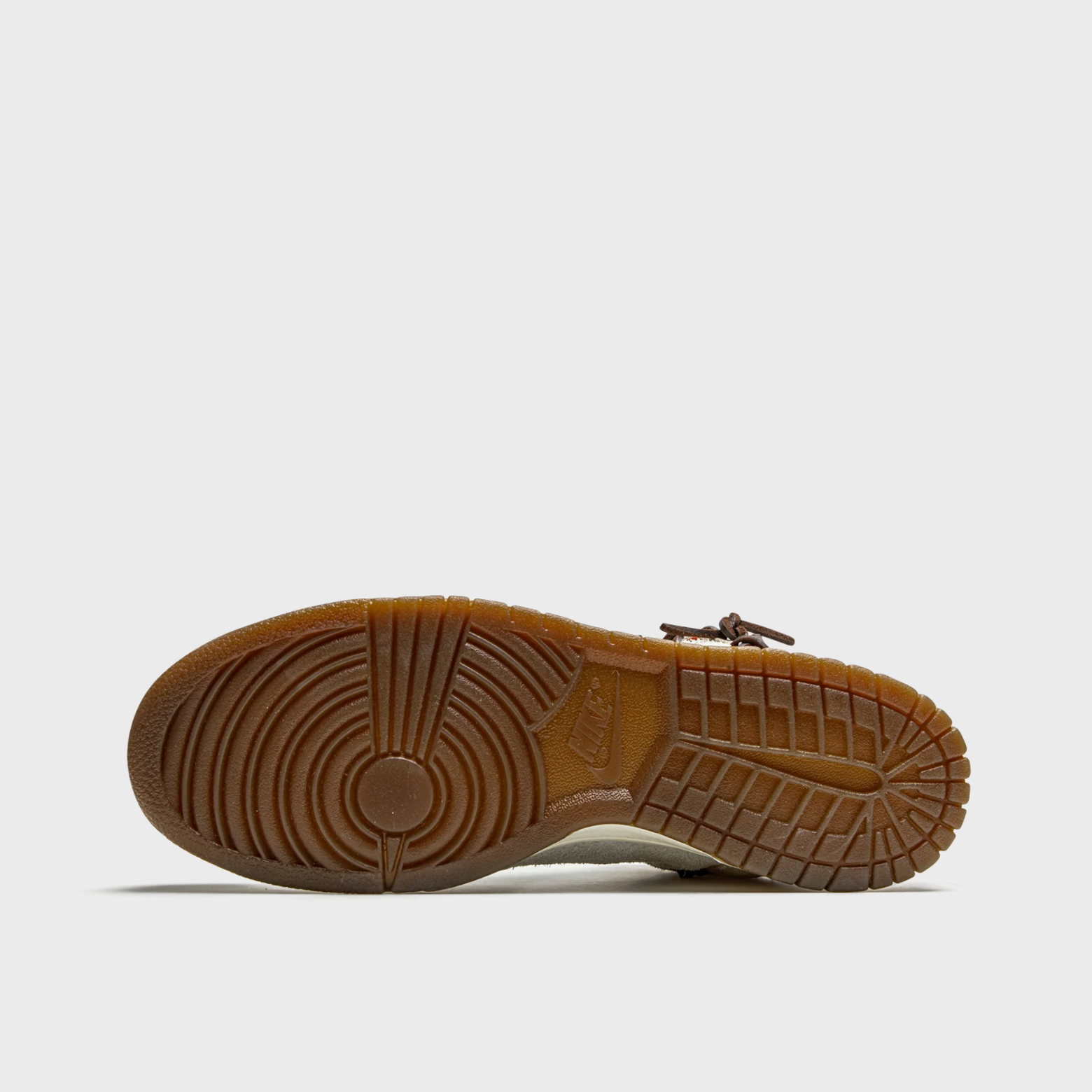 The Nike Dunk High Bodega Sail Multi features a suede toe wrap that leads into the perforated toe box in the Sail color, as well as pebbled white leather eyestays connecting to the Birch suede quarter panels, a tortoiseshell jewel Swoosh on the lateral side, and a Bodega brand on the medial side. The design also features Rustic leather ankle overlays and a mismatched Birch, boot-stitched, Sail heel featuring a heel pull tab in Fauna brown, Sail leather sockliner, and a University Red insole.