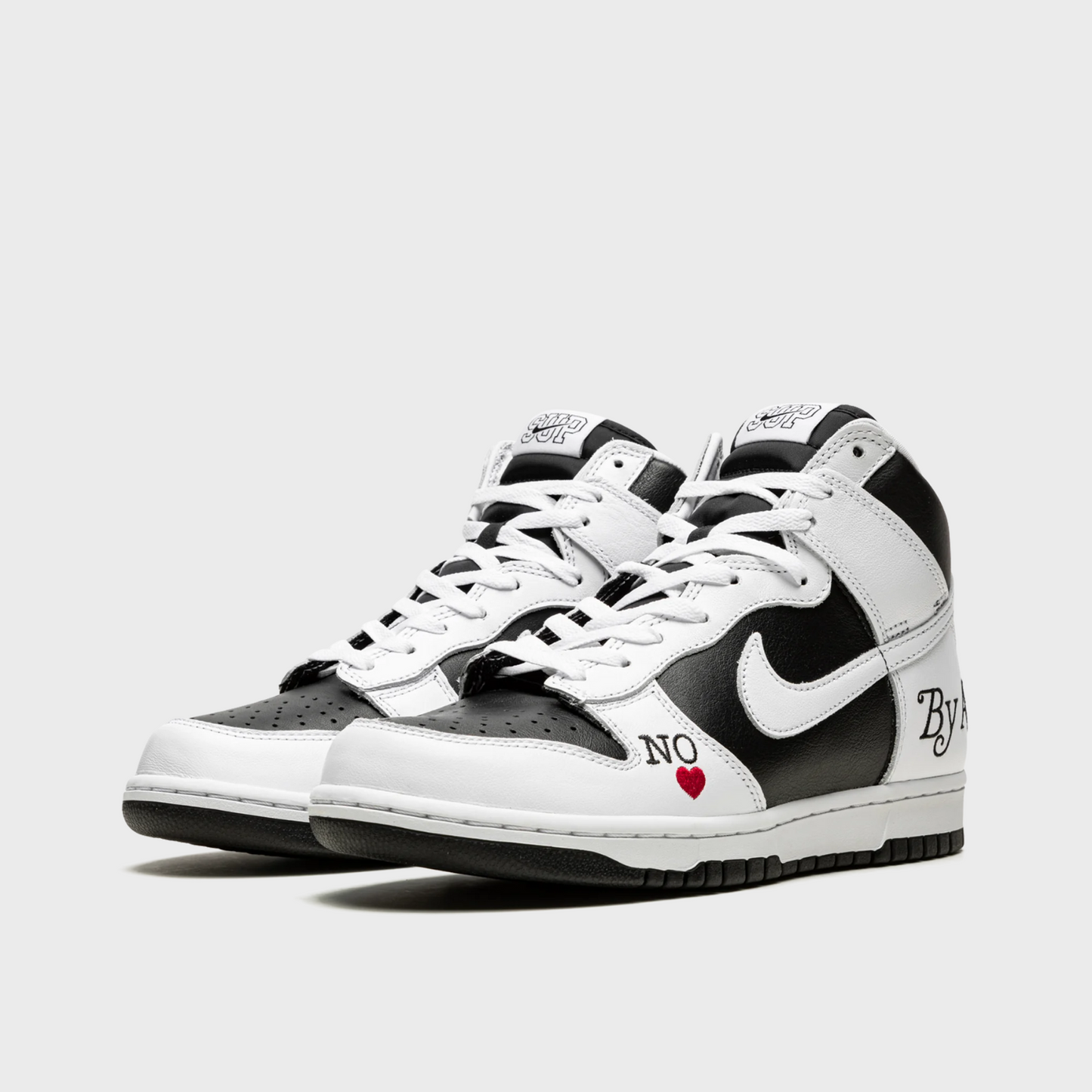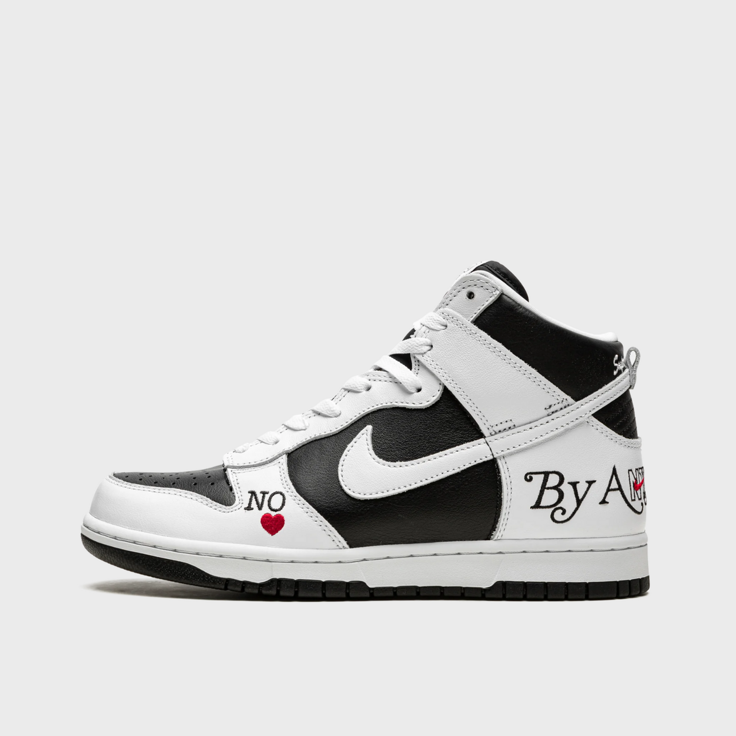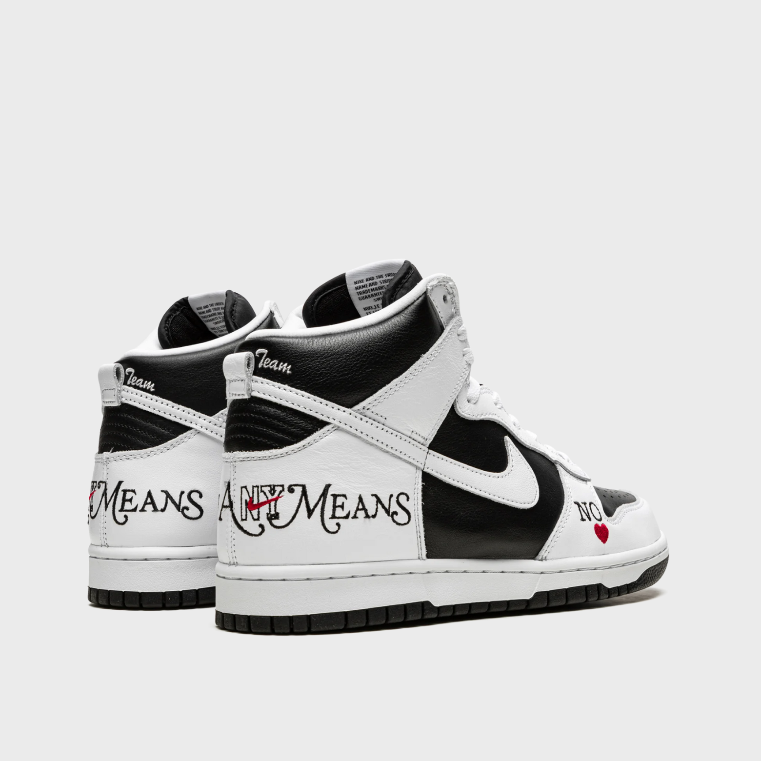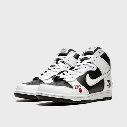 The Nike SB Dunk High Supreme By Any Means Black draws inspiration from the Nike Dunk High Storm Trooper, a Japanese-exclusive Nike Dunk CO.JP colorway that was released in 1999. Constructed with a black and white leather upper, this Nike SB Dunk High sets a neutral background, allowing its decorative embroidery to shine. Customized "SUP" woven tongue labels, "By Any Means" and Nike NYC heel embroideries, "Supreme Team" collar embroidery, and a "No Love" toe embroidery complete the design.